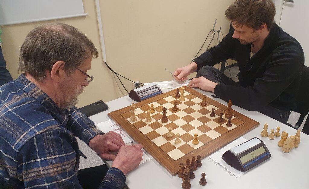 Riktignok oppdaget hvitspiller Audun mens de satt ved brettet, at Lars Joachim kunne sette ham sjakk matt i tre trekk – men Lars Joachim så det ikke! Nå vant han likevel, og med hele poenget vel i havn gjorde det nok ikke så veldig vondt å bli minnet på den matten han overså.
